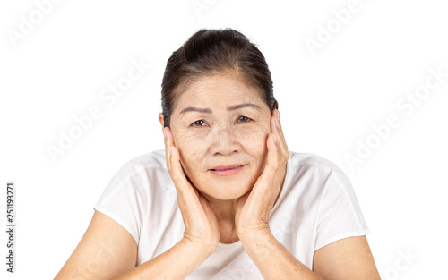 old asian woman in isolated studio head shot with beauty concept