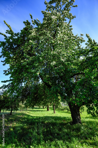 Old beautiful cherry tree in bloom early in June