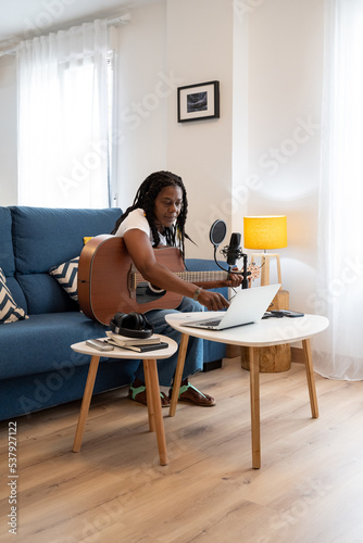 beginner, black, chord, computer, couch, course, creativity, e-learning, education, educational, enjoy, female, guitar, guitarist, home, indoor, inspiration, cyberspace, lady, laptop, learn, avocation, living room, microphone, music, musical instrument, musician, new, online, performer, play, reading, record, room, senior, sing, singing, sitting, sofa, song, talent, training, try, tutorial, video, vocal, woman, working