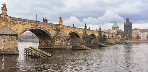 Old Charles Bridge crossing the Vltava River in the UNESCO city of Prague, Czechia.