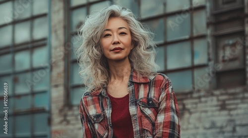 old, chinese, woman, blond, curly, hair, portrait, face, person, human, character, profile, head, model, skin, individuality, identity, feminine, female, lady, elderly, senior, aged, ageing, elder, wrinkle, grunge, 1990, aesthetic, flannel, shirt, ripped, jean, alternative, rock and roll, realistic, photorealistic, clothing, outfit, illustration, design, decorative, creative, colours, poster, generative, ai