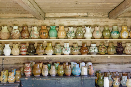old clay dishes stand on shelf