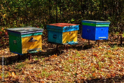 agriculture, allergy, apiary, apiculture, autumn, bee, beehive, apiculture, blue, box, bright, collecting, colony, colourful, countryside, ecology, fall, farm, foliage, forest, glade, grass, green, harvest, hive, hobby, honey, honeycomb, insect, landscape, leaf, meadow, nature, nectar, nobody, orange, outside, pollen, ranch, rural, small, swarm, tree, village, warmth, wood, wooden, timberland, yellow