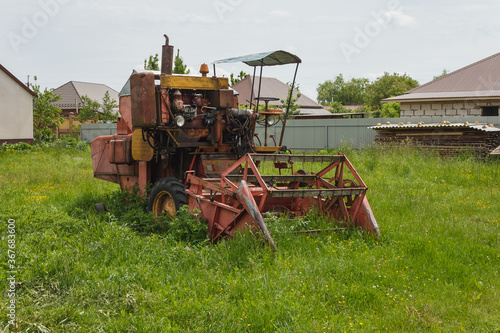 Old combine harvester in the village yard. Old agricultural machinery