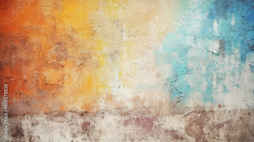 Old concrete wall with peeling pastel paint. Grunge wallpaper. Orange, blue, gray colors.