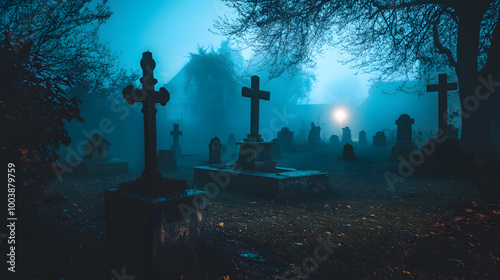 Old creepy graveyard, spooky cemetry with fog and mist. scary concept for halloween