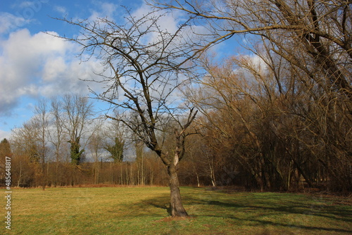 tree, nature, sky, landscape, tree, blue, green, park, countryside, leaf, forest, plant, cloud, season, meadow, outdoors, old, alone, winter, single, damaged