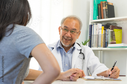Old doctor in professional uniform examining young patient woman at hospital or medical clinic. Health care , medical and doctor staff service concept.