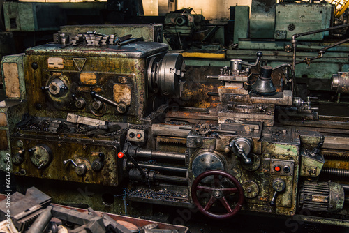 Old equipment, machines, tools in a rustic style in an abandoned mechanical factory