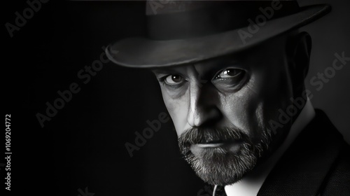 Old fashioned detective or mafia in hat on dark background, black and white color