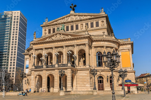Old Frankfurt Opera in the city center. Historic building in springtime in sunshine. Street lights with space in front of the building. Business buildings in the background