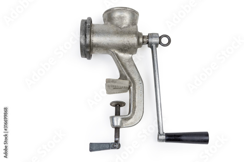 grinder, assembled, mounted, kitchen, cooking, preparation, shredding, food, meat, minced meat, ground meat, utensil, kitchen utensile, mechanical, metal, rural, old, vintage, rustic, isolation