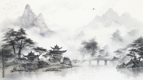old house in the mountains, Ink landscape painting