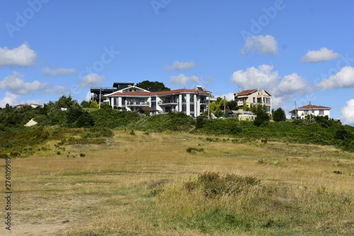 house, landscape, sky, architecture, home, grass, building, blue, village, farm, green, nature, field, countryside, country, meadow, summer, agriculture, house, rural, tree, new, residential, france, villa