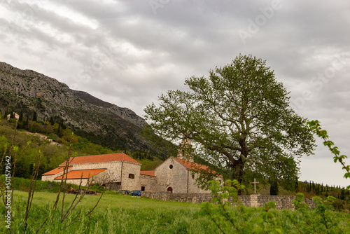 Old Latin church in valley on a spring day