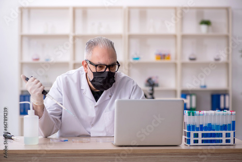 Old male chemist working at the lab