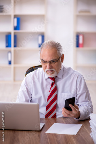 old, businessman, man, business, office, employee, manager, working, computer, laptop, online, cyberspace, call, calling, video, telecom, meeting, virtual, social, conference, teleconference, distance, discussing, explaining, smartphone, mobile, phone, speaking, talking, thinking, concerned, focused, concentrated, concentration, accountant, workaholic, workload, tied-up, auditor, adviser, boss, paper, paper, deadline, missing, reporting, desk, analyst, sitting