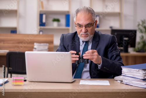 Old male employee auditor holding binoculars at workplace