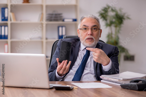 old, man, businessman, employee, boss, working, office, smartphone, mobile, phone, speaking, talking, discussing, explaining, call, video, telecom, meeting, virtual, social, distance, computer, pointing, showing, demonstrating, business, manager, accountant, workaholic, workload, tied-up, auditor, lawyer, adviser, experienced, work, executive, reporting, pressure, desk, analyst, accounting, men at work, deadline, overtime, missing, pile, suit, sitting