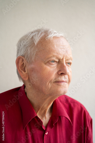 aside, background, casual attire, closeup, clothing, confident, face, head, looking, portrait, positive, profile, red, retirement, shirt, studio, wall, white hair, wrinkle