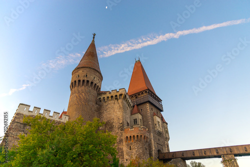 Old medieval castle in the morning at the sunrise, Corvinesti Castle, Romania