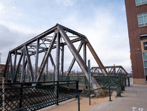 Old metal pedestrian bridge in downtown Denver