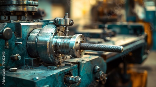 Old metal working machine, retro lathe on background.