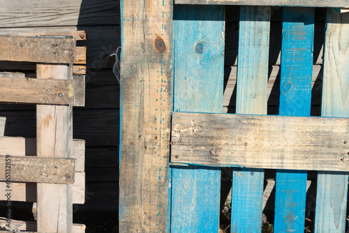 old, pallet, sun, wood, structure, stained, blue, shipping, platform, deck, transportation, good, logistic, construction, simple, background