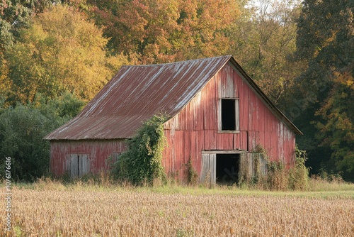 barn, red, old, weathered, rustic, abandoned, field, harvested, autumn, fall, tree, colourful, foliage, landscape, rural, countryside, agriculture, farming, nature, scenic, picturesque, vintage, nostalgic, decay, textured, wood, metal, roof, door, window, overgrown, vine, plant, peaceful, serene, solitude, simple, traditional, iconic, american, us, horizontal