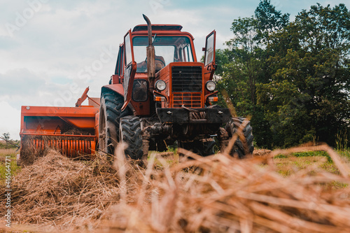 Old red tractor in the field, Ukrainian fields and old machinery, hay harvesting in the field.