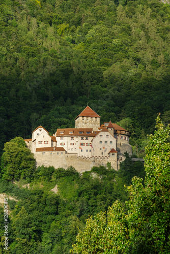 old royal medieval castle in the mountains swiss alps with green forest around in summer in smallest country in europe