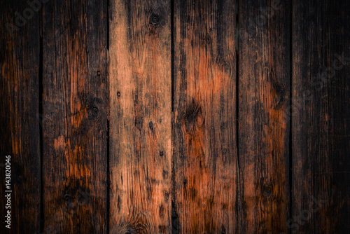 Old rural wooden wall in dark brown and orange colors, detailed plank photo texture. Natural wooden building structure background.