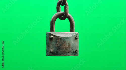 Old rusty padlock hanging from a metal chain against a vibrant green screen background.