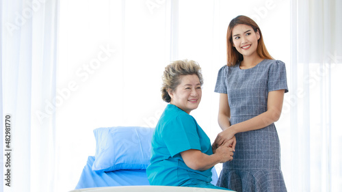 Old senior Asian happy healthy recovery mother patient in hospital uniform sitting smiling on bed while young woman daughter visiting standing holding hands with love and care in clinic wardroom