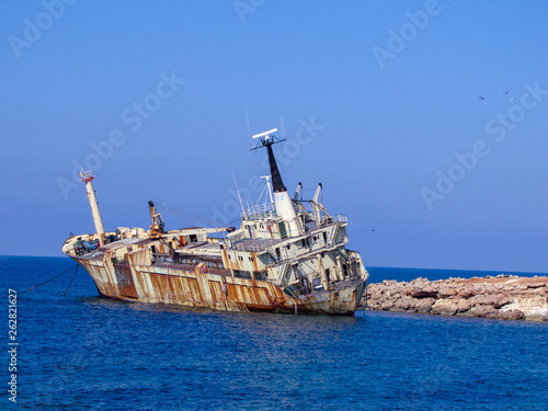 ship, wreck, sea, cyprus, boat, water, blue, shipwreck, sky, harbor
