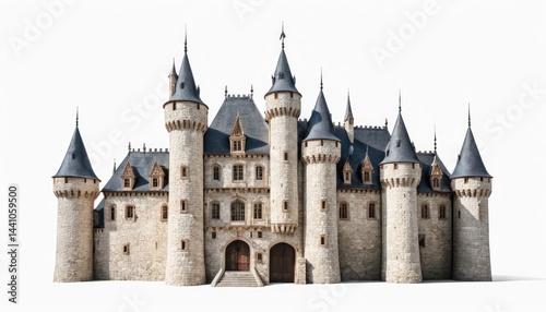 Old stone castle, a historical building in Europe with medieval architecture and towers, standing on a white background