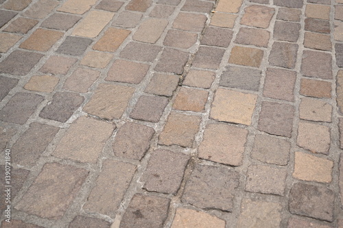 Old stone pavement with beige and brown cobblestones in a historic European city. Weathered texture background for architecture and travel concepts.