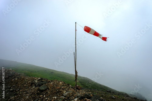 Old striped red-white windsock, indicator of the strength and direction of the wind in the Caucasus mountains in the fog, Aibga ridge, hike, trekking, travel