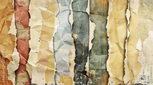 Old torn paper striped layers on grunge wall with peeling colorful posters abstract texture background