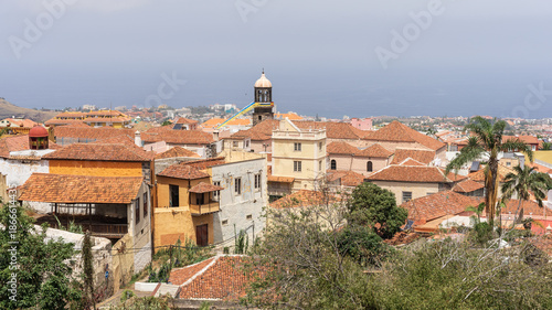 Old town rooftops with church tower and Atlantic Ocean view, La Orotava skyline from Victoria Gardens, Tenerife, Canary Islands.