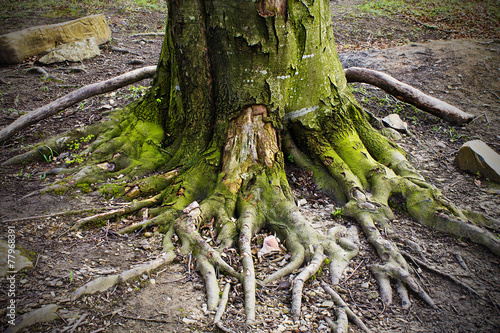 old tree with big roots, moss-grown