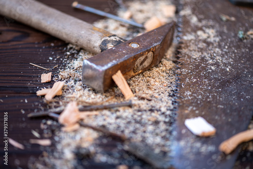 Old vintage hammer, wood saw, nails and sawdust on a wooden background, close-up, selective focus.