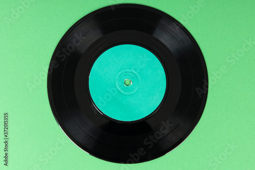 Old vinyl disc on green background. Old vintage vinyl record.