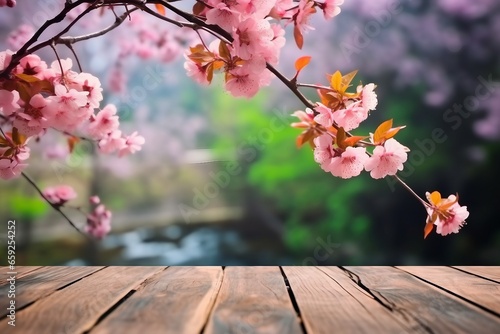old wood floor with pink Sakura flowers blooming blossom blurred background. generative ai.