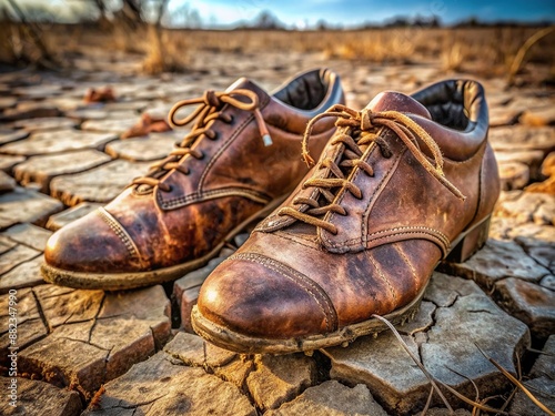 Old worn football boots with scuffed leather, rusty studs, and faded laces lay abandoned on a patch of dry, cracked earthy ground surrounded by withered grass.