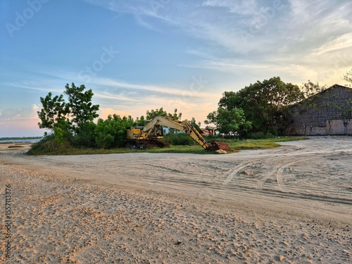 Old yellow excavator with rusted bucket parked near trees on a construction site at sunset sky