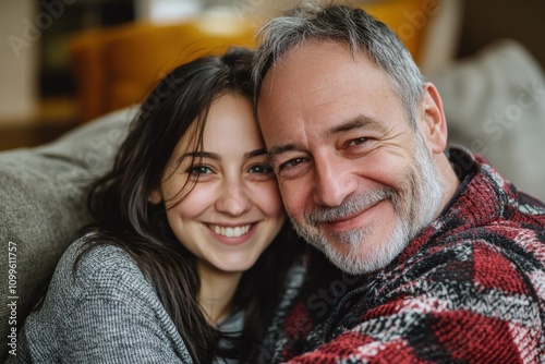 Older Father and Grownup Daughter Embracing in Heartfelt Portrait on Cozy Couch