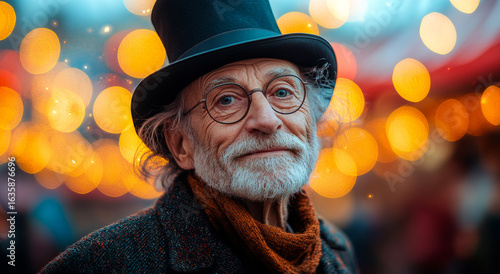 Older man smiles at festive gathering. An older man wearing a top hat and glasses smiles warmly at a lively festive gathering with colorful lights.