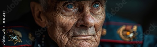 Older man wearing military uniform with blue eyes and a hat, banner, copy space
