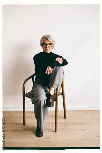 50s, age, bright, casual attire, chair, comfort, confident, cosy, elegant, expression, fashion, film, goggles, grain, grey, hair, happiness, indoor, lifestyle, light, minimalistic, neutral, personal, portrait, posture, room, seating, serenity, sitting, style, stylish, sweater, tone, trend, trousers, warmth, wooden